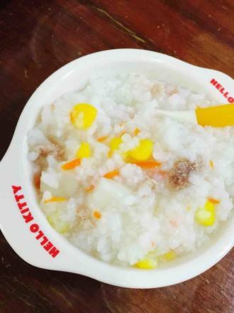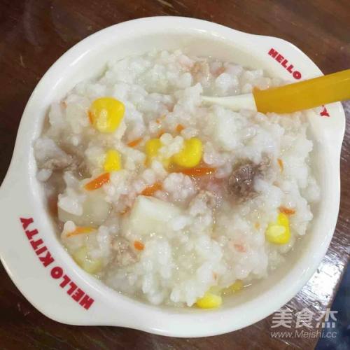 1山药一小块,胡萝卜四分之一,瘦肉剁成末,玉米剥了皮比较好消化,大米一杯。