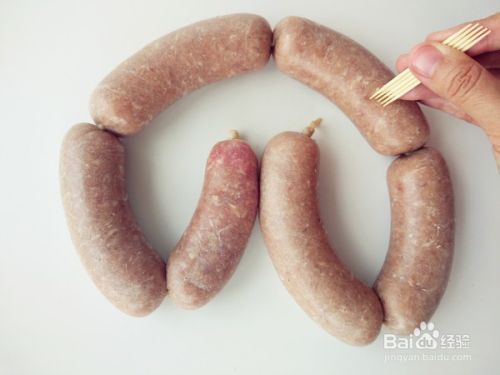 用香肠锥或牙签在表面扎一些孔,这样煮的时候不会涨破。捏住香肠两端,像摇动跳绳一样,第一段朝前转动两三圈,第二段向后转动两三圈,摇的同时把肉馅稍往中间推动紧凑,尾端打结。