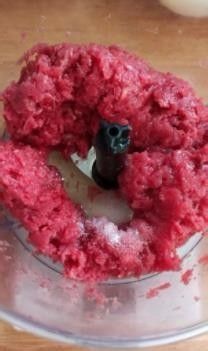 先将牛肉馅放入ACA的搅拌杯中搅打3分钟,搅拌成较细腻的肉蓉,加入9g盐、一个冷藏的鸡蛋清继续搅打3分钟。