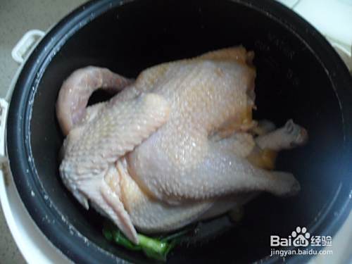盖上盖,按下按钮煮饭键,当电饭锅自动跳到保温状态,把鸡换另外一面,继续按下煮饭键,自动跳到保温状态即可(如鸡比较大可以来回这样翻身,直到鸡熟为止)。