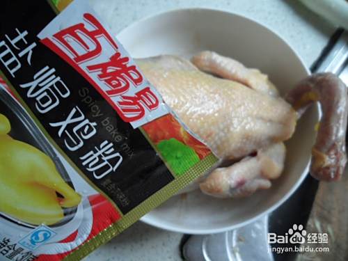 准备好盐焗鸡粉,盐焗鸡粉均匀的抹在鸡表面和鸡肚内,腌制1小时左右。