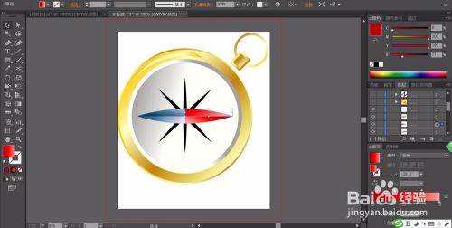 继续用钢笔画出指南针表面的指针,我们用蓝色的渐变与红色的渐变分别填充左右两侧,底下再用钢笔画出星形指针并用黑色进行描边。