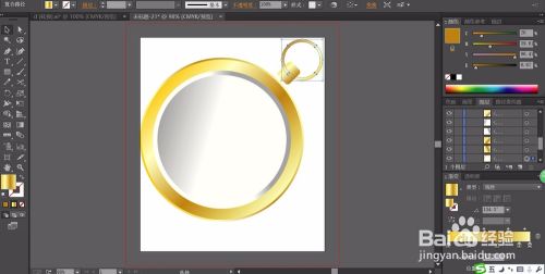 继续使用矩形与圆形工具画出指南针的顶端拉手所在的圆环与结构件,我们也用金色的渐变填充。