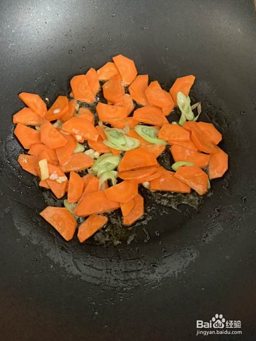 倒入适量的油,放入葱姜蒜后,放入胡萝卜炒。