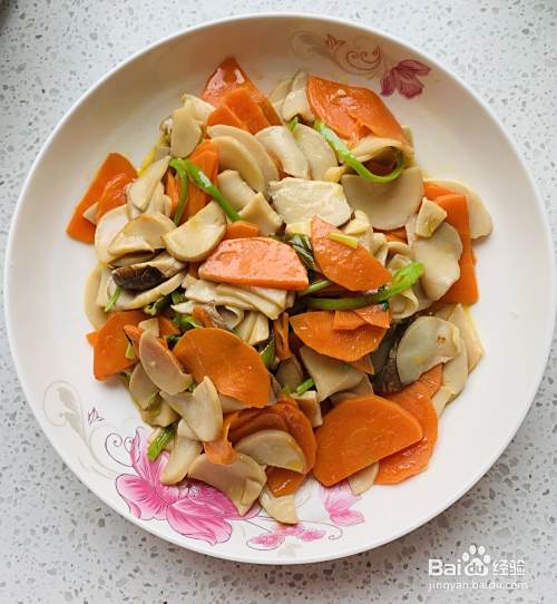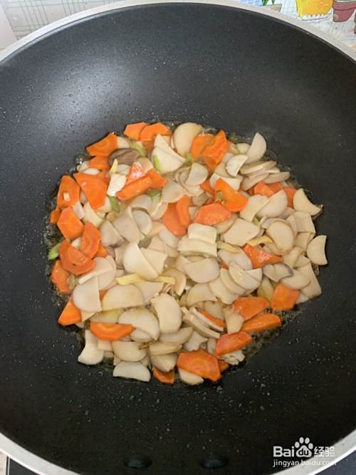 胡萝卜炒出黄汁变软,放入杏鲍菇。