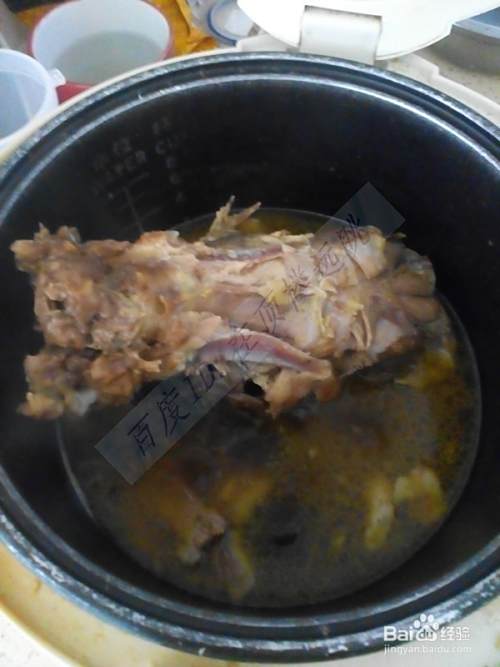 鸡骨架放电饭煲里,放1个草果和2个大料,放漠过鸡架子的凉水,煲40分钟。