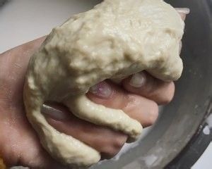 洗面,双手在盛有水的小盆或大碗中揉捏,分三次洗面,每次洗面后,待水中的面浆能厚厚的一层挂在手上缓慢退去时,再将搓洗好的水倒入另一个大盆中,然后开始第二次、第三次洗面,每次洗面后的水都倒在同一个盆中(方便静置),直到洗面的水不再变白变浑浊,面筋就洗好了(如图)。