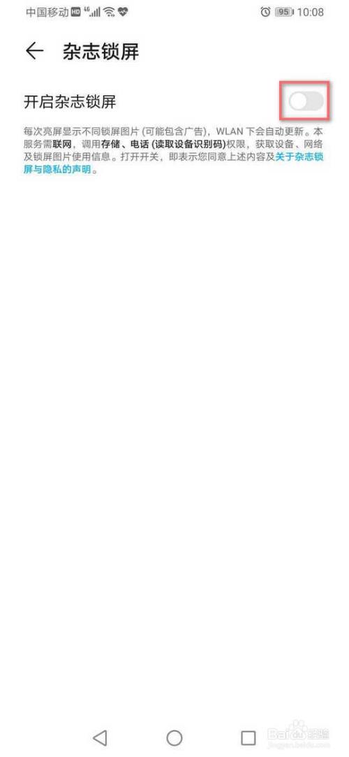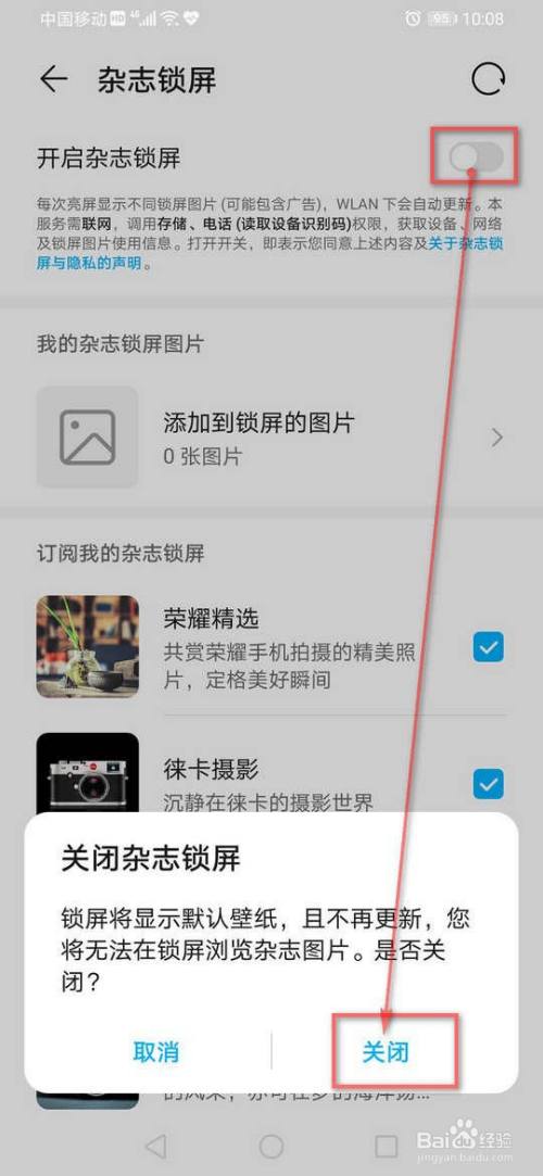 点击“开启杂志锁屏”边上已经点亮的小滑块,再点击“关闭”即可关闭杂志锁屏功能。