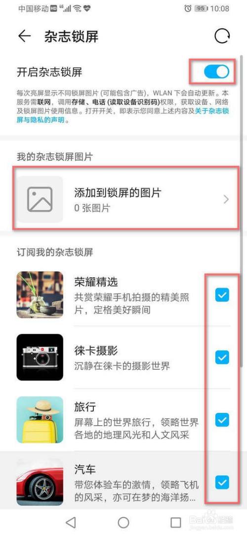 根据个人喜好√选订阅杂志锁屏也可以点击“添加到锁屏的图片”设置自己个性化的杂志锁屏图片。