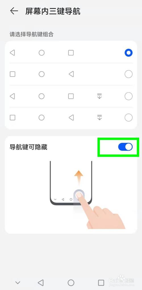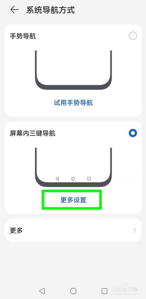 在【系统导航方式】页面——选择【屏幕内三建导航】下方的【更多设置】——点击开启【导航键可隐藏】功能右侧的开关即可