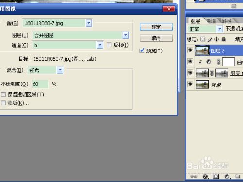 按ctrl+shift+alt+e执行盖印可见图层,选择“图像”→“应用图像”,选择b通道,混合为强光,不透明度为60,确定。