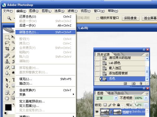 然后马上选择“编辑”→“渐隐去色”,不透明度设置为70,确定。渐隐去色要在去色之后才能执行,不能单独使用。