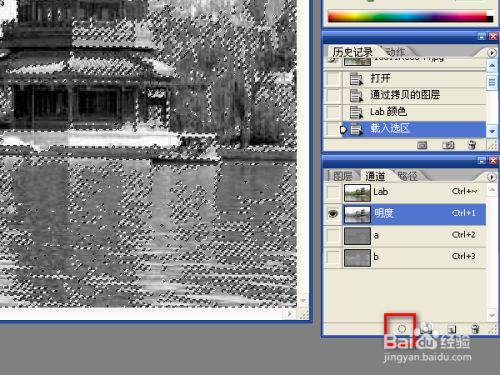 在“图层窗口”中选择“通道”选项,选中“明度”通道,点通道窗口下方的“将通道作为选区载入”按钮,载入选区。选中“lab”,回到图层选项。