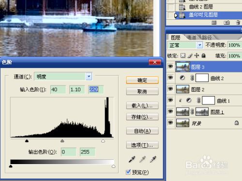 再执行盖印可见图层,按ctrl+l打开色阶窗口,通过调整三角滑块的位置来改变图像的明暗对比,满意后,确定。