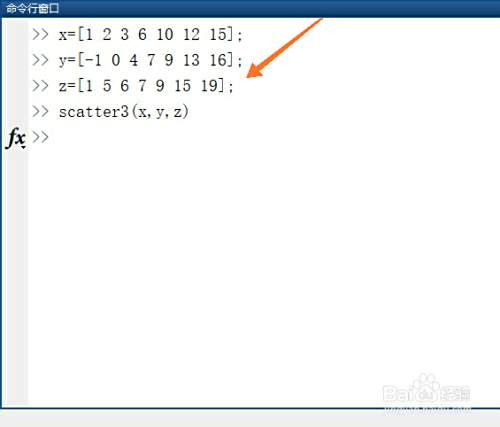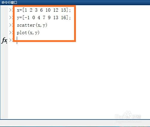 x和y的个数应该一致,下面在命令行输入“scatter(x,y)”命令。