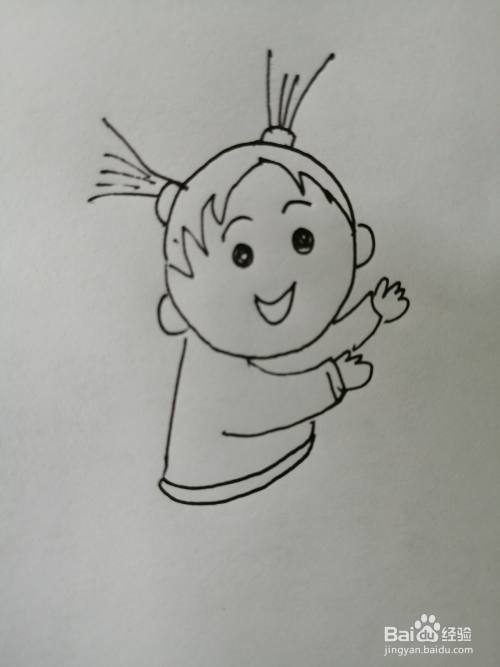第六步,然后把可爱的小女孩的衣服画出来,注意小女孩衣袖的画法。