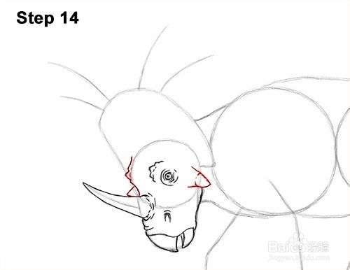 第14步:沿着其他眉毛的最初圆圈的左边缘绘制一系列三角形形状。在头部的右侧,为颧骨上的尖刺画出更大的三角形形状。在左侧为Styracosaurus的另一个颧骨钉画一个更小的三角形形状。