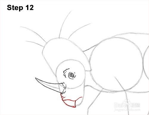 第12步:使用头部下方的U形线作为引导,以画出Sty龙的嘴巴顶部。嘴形状像鸟嘴,所以使顶部弯曲,尖尖尖。在嘴的肉质基部的喙上方添加波浪线。