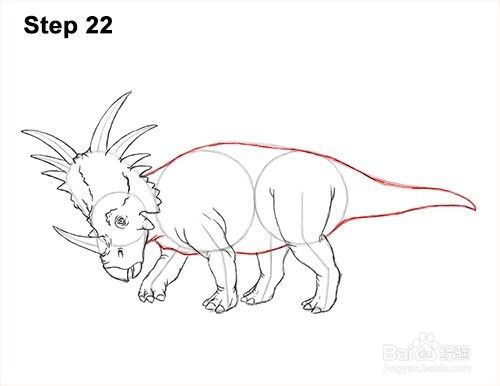 第二十二步:用剩余的线条作为向导,画出其余的戟龙恐龙的身体。只需将初始引导线的外边缘变暗即可创建身体的形状。不要重叠在身体这一侧的腿。使尾巴变得更粗糙,使其更加坚硬和更有机。