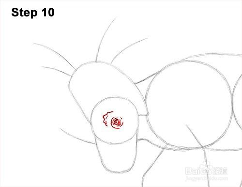 第9步:画出两条短而弯曲的线条,将头部连接到身体以形成颈部。画出连接两个大圆圈的两根较长的曲线来完成身体的导向。在身体的右侧,画出两条长长的波浪线作为恐龙尾巴的指南。尾巴的左侧应该宽,右侧应该结束在一个尖细尖端。