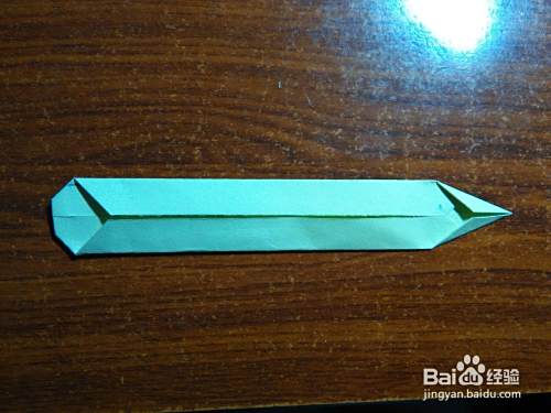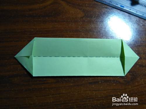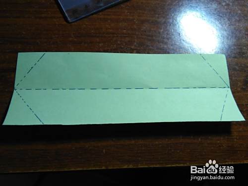 按照下图的虚线,将一端的角往后折,两一端的两角向中线折,如下图。