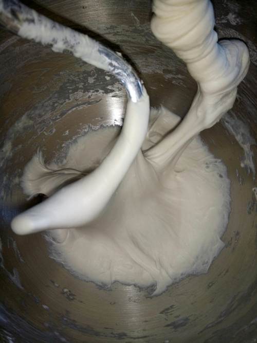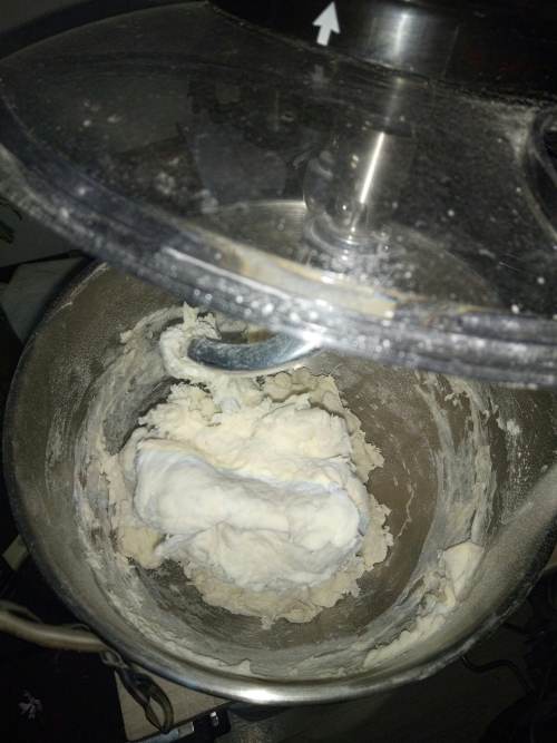 1把500克面粉和310克水混合到一起,厨师机1档2分钟搅拌均匀。
