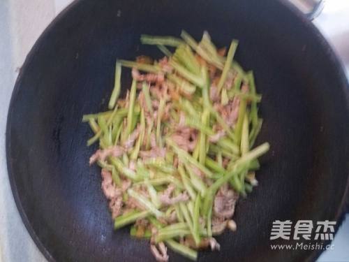 11将辣椒,蒜片,榨莱等一齐倒入,炒散。