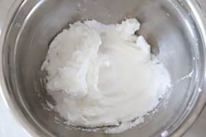 在搅打的过程中将剩余的白砂糖全部倒入打蛋盆中,将蛋白打发至干性发泡状态(即九分发)。