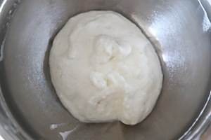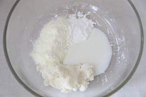 将山药去皮后蒸熟,然后用擀面杖将山药压成泥状,接着和酸奶、奶粉、淀粉一同装入一个稍微大一点的碗中。