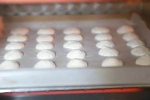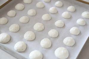 准备一个烤盘,铺上油纸,然后将蛋白均匀的挤在油纸上面,两两间稍微留一些距离,防止烤制时粘连到一起。