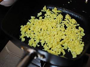 在锅中倒上一些油,油稍微热一下之后就在里面倒入蛋液,然后用筷子炒散成蛋花碎