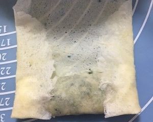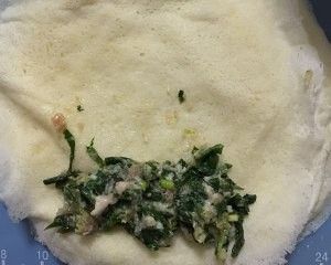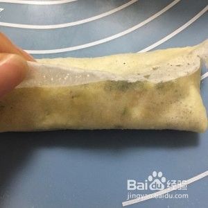 把馅放在靠近身子的这侧春卷皮上,然后开始卷