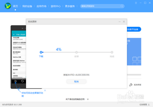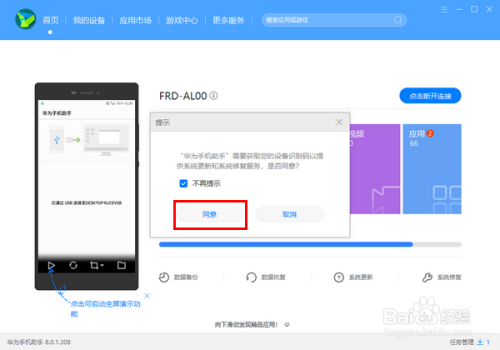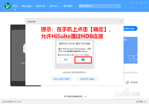 这时,如果你的手机上尚未安装华为手机助手,会自动向手机安装华为手机助手。我们要做的,只需要在电脑端点击“确定”即可。