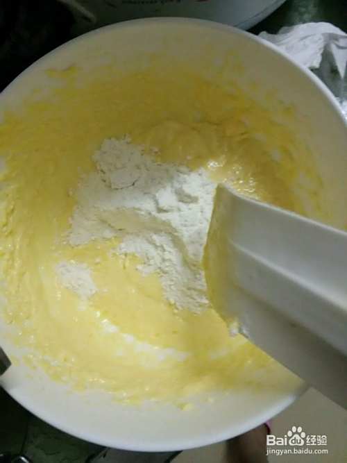 用打蛋器打黄油变得蓬松,颜色浅后倒入全蛋一只,搅拌均匀后,用勺子把低粉和奶粉的混合一勺一勺逐一加,每加一次用搅拌工具搅拌均匀后才加下一勺