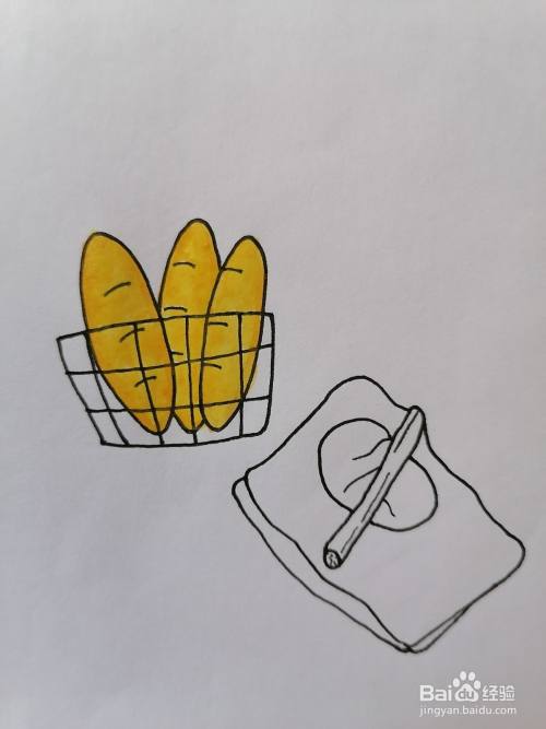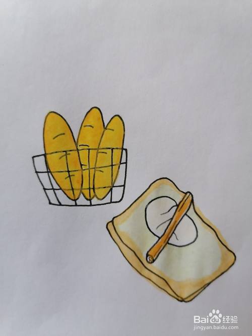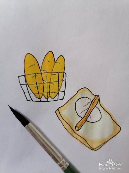 用藤黄水彩厚涂一遍面包,用桔黄水彩将面包边沿浅涂一遍,也可以用其他好看的颜色涂