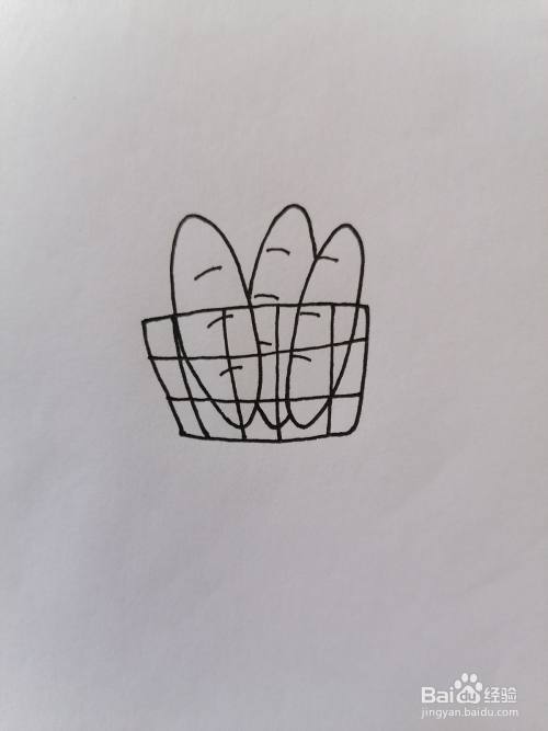 首先用笔在纸上画三个窄长的椭圆形,在上面画几道横线,在外面画一个方格篮子