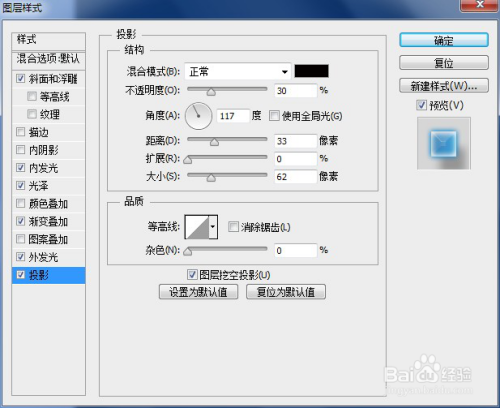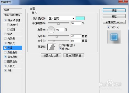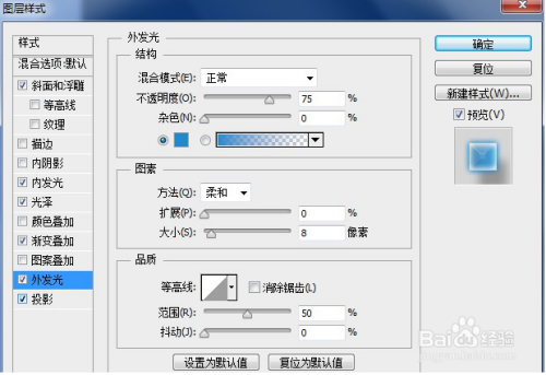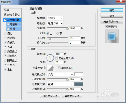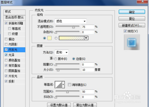 为圆角矩形添加立体效果单击图层面板中的 【添加图层样式】按钮。分别设置斜面和浮雕、内发光、光泽、渐变叠加、外发光、投影,如图所示。