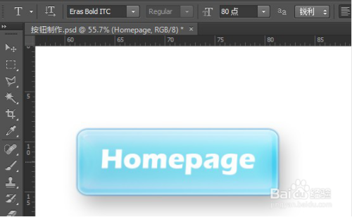 添加文字并设置效果使用工具箱中的 “横排文字工具”,字体大小为80点,英文字体(Eras Bold ITC),颜色为纯白色,输入内容为Homepage,如图所示。