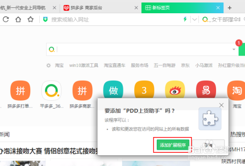 将上货助手插件拖进网页,弹糟虚诉出相关对话框,点击【添加扩展程序】,完成安装。