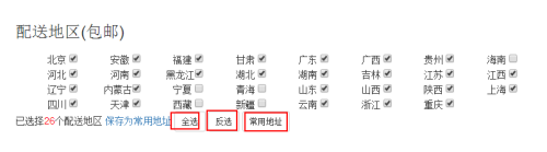 选择包邮配送地区,可以全选、反选、常用地址或手动单个选择。