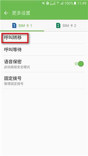 5.选择要设置呼叫转移的SIM卡,这里以选择【SIM卡 1】为例,然后点击【呼叫转移】。(注:这里以使用G网手机卡(移动、联通)为例介绍。)
