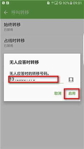 7.输入要转移的号码(也可以点击右侧的“联系人”图标添加号码,这里以输入号码为例),然后点击【启用】。