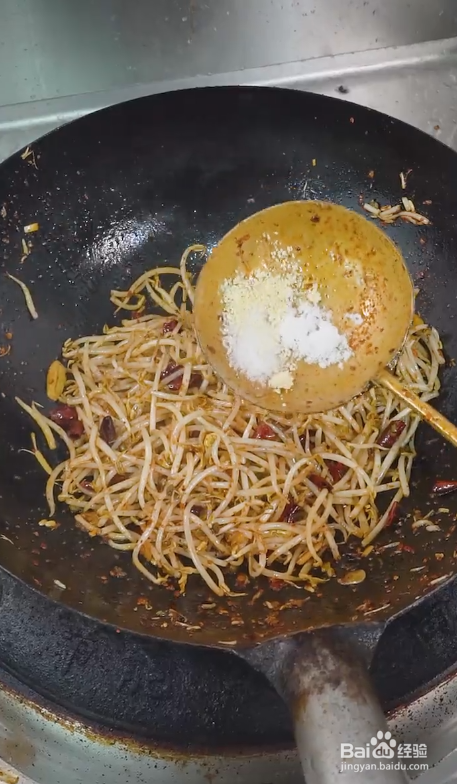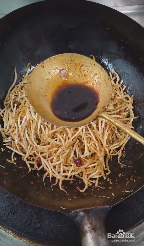 加入适量的陈醋,往锅边上喷,在翻炒豆芽。