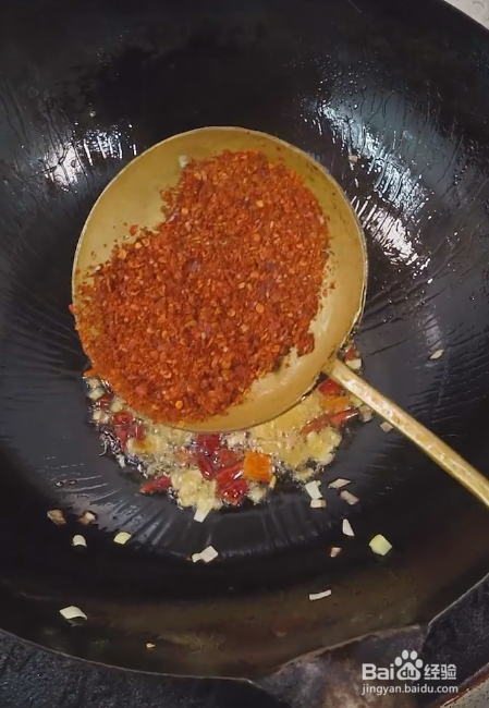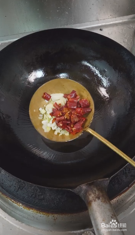 热锅烧油,放入干辣椒段,葱,姜片,蒜片炒香。