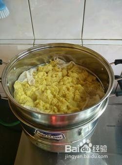 锅里烧开水,笼屉上铺上笼布,把面均匀撒在笼屉上。