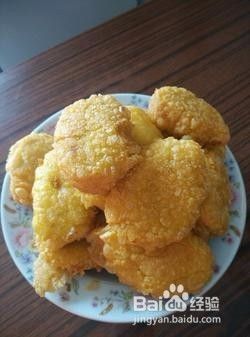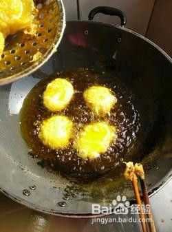 一个一个把糕放入油中,不要挨在一起,挨着容易粘成一块儿。一面炸透再翻另一面炸透,两面都炸成金黄色,起泡泡,就可以捞出了。