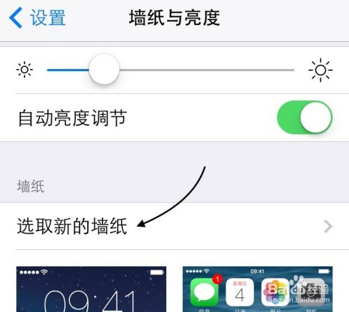 在墙纸与亮度设置界面里,点击“选取新的墙纸”一栏,如图所示
