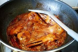 接着倒入鸭头,来2勺生抽、一勺料酒、半小勺老抽、一大勺的豆瓣酱和适量冰糖,翻炒让汤汁均匀包裹食材。