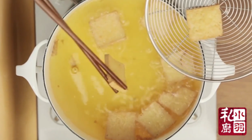 2筷子放入油中,周围有小泡泡出现就可以放入切好的豆腐片,炸成金黄色之后捞出。