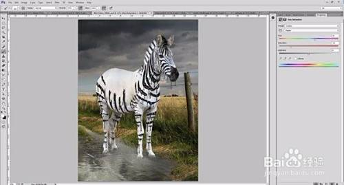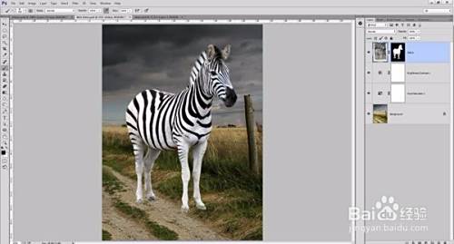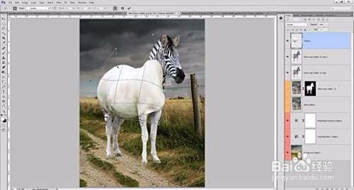 置入斑马。转到图层>栅格化>智能对象(元素用户:选择简化)。抓住钢笔工具( P ) (元素用户:使用多边形套索工具)并创建斑马周围的路径。在选项栏上,选择“进行选择”,然后单击“确定”。